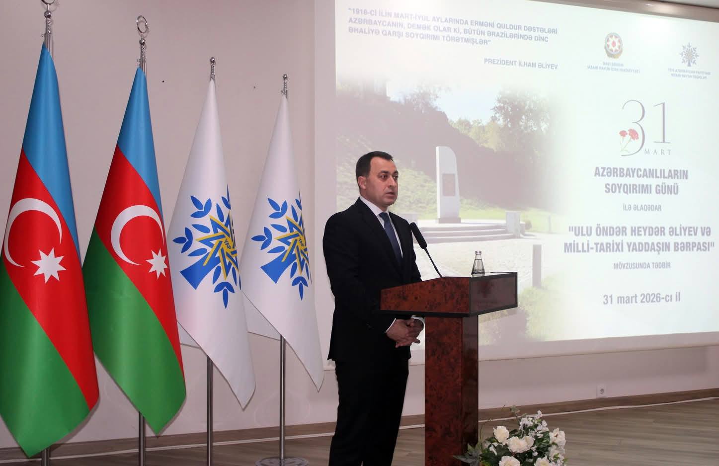 Bildirilib ki, xalqın təkidli tələbi ilə Ümummilli Lider Heydər Əliyevin hakimiyyətə qayıdışından sonra soyqırımına siyasi-hüquqi qiymət verilib. Ümummilli Liderin 1998-ci il martın 26-da imzaladığı Fərmanla 31 mart Azərbaycanlıların Soyqırımı Günü elan edilib. Bu fərman təkcə tariximizin qanlı səhifələrinin öyrənilməsi və yaddaşlarda həkk olunması ilə deyil, erməni şovinizminin və terrorunun ifşa olunması baxımından da əhəmiyyətli olub.