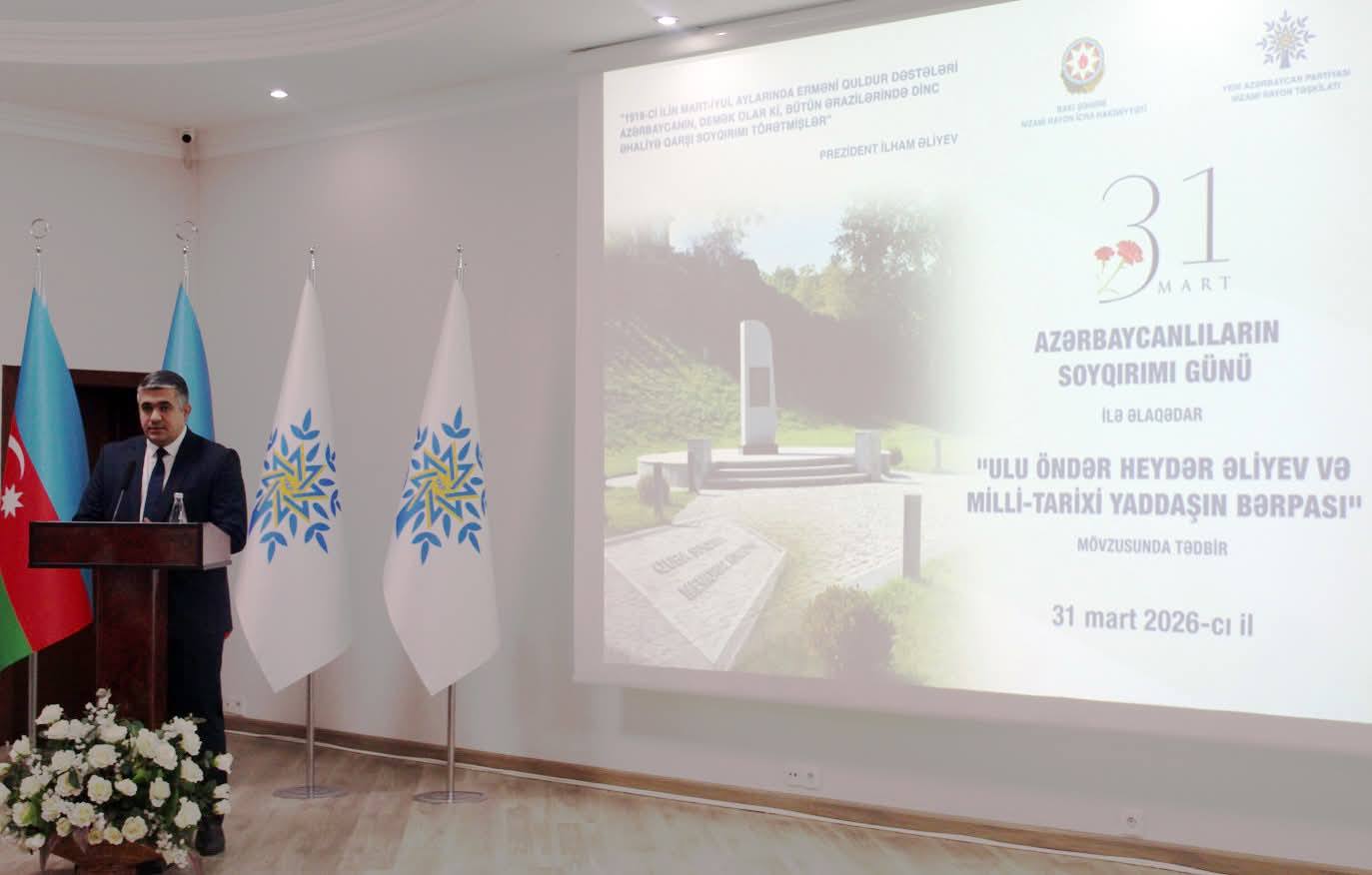 Nizami Rayon İcra Hakimiyyətinin və Yeni Azərbaycan Partiyası Nizami rayon təşkilatının 31 mart – Azərbaycanlıların Soyqırımı Günü ilə əlaqədar “Ulu Öndər Heydər Əliyev və milli-tarixi yaddaşın bərpası” mövzusunda birgə tədbiri keçirilib.